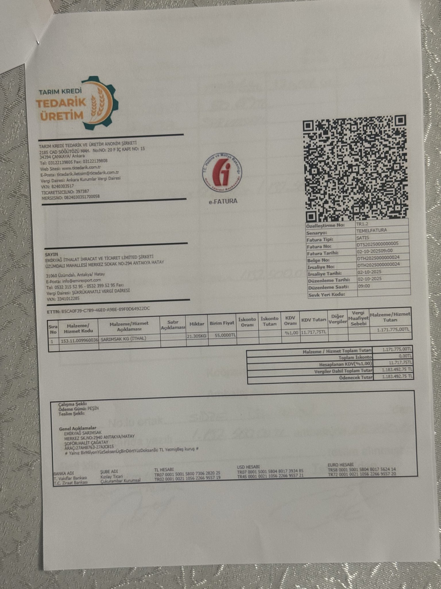Ama belgeler gösteriyor ki, Tarım Kredi Tedarik ve Üretim A.Ş. — ki bu şirket doğrudan Tarım Kredi Kooperatifleri Merkez Birliği’ne bağlı ve dolayısıyla Tarım Bakanlığı’na bağlıdır — Suriye/Cinderes’ten Sidre Deviren adlı kişiden tonlarca sarımsak almış.