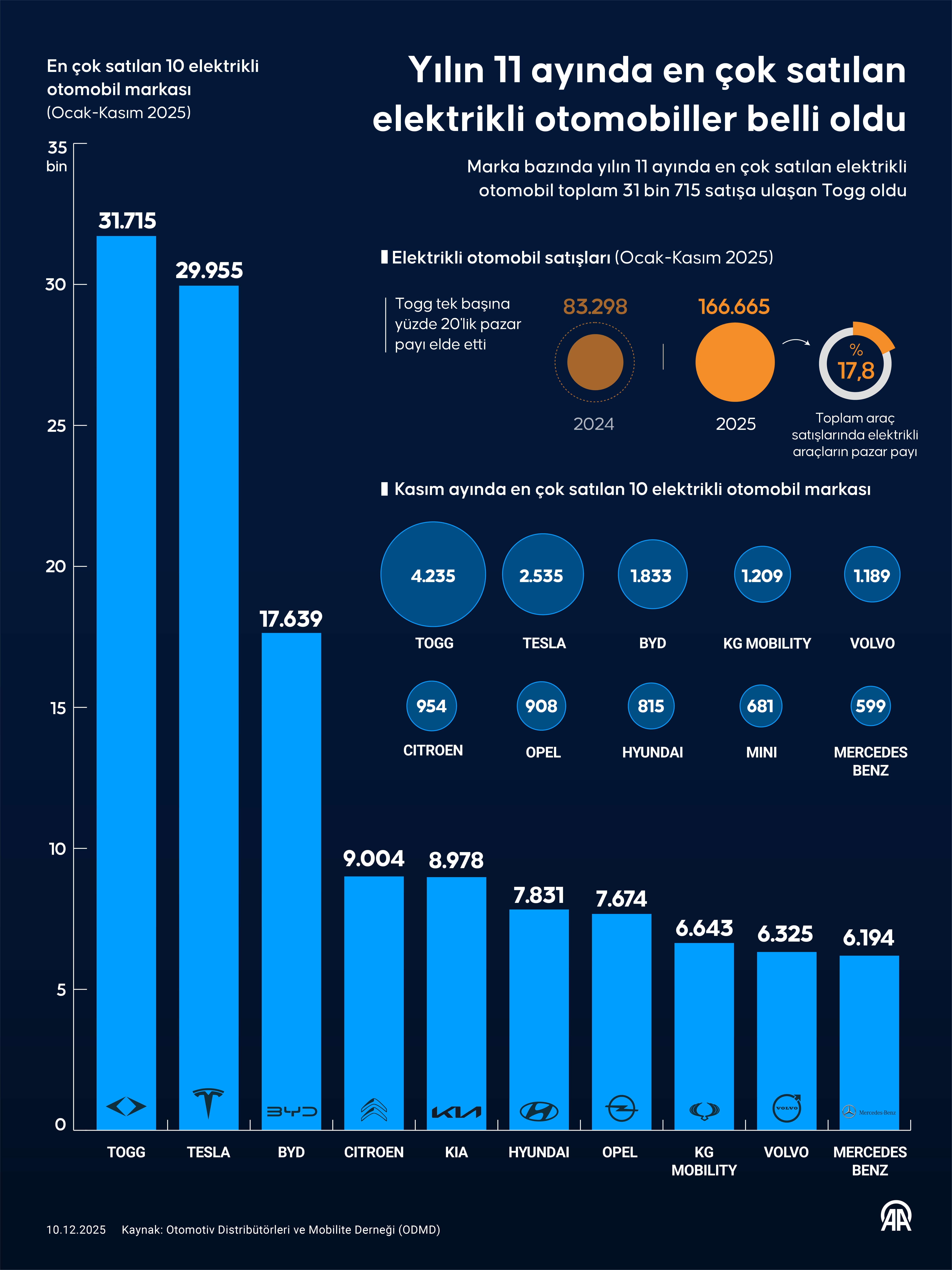 ODMD verilerine göre, 2025’in kasım ve ocak-kasım döneminde en çok satılan ilk 10 elektrikli otomobil markası şöyle: