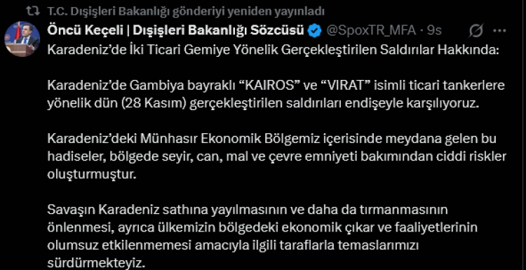 ANKARA (İGFA) – Dışişleri Bakanlığı Sözcüsü Öncü Keçeli, Karadeniz’de Gambiya bayraklı KAIROS ve VIRAT adlı ticari tankerlere 28 Kasım’da düzenlenen saldırılara ilişkin yazılı bir açıklama yaptı.