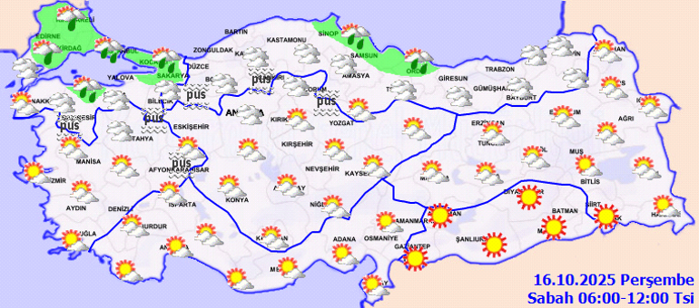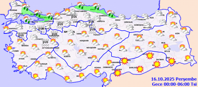 Meteoroloji Genel Müdürlüğü tarafından yapılan tahminlere göre, ülkemizin kuzey, iç ve batı kesimleri parçalı yer yer çok bulutlu, Marmara’nın doğusu, Trakya, Batı Karadeniz, Orta ve Doğu Karadeniz kıyıları ile Balıkesir’in kuzeyinin aralıklı yağmur ve sağanak yağışlı, diğer yerlerin az bulutlu ve açık geçeceği tahmin ediliyor. Gece ve sabah saatlerinde Marmara’nın güneyi, Ege ve Batı Karadeniz’in iç kesimlerinde pus ve yer yer sis hadisesi bekleniyor.